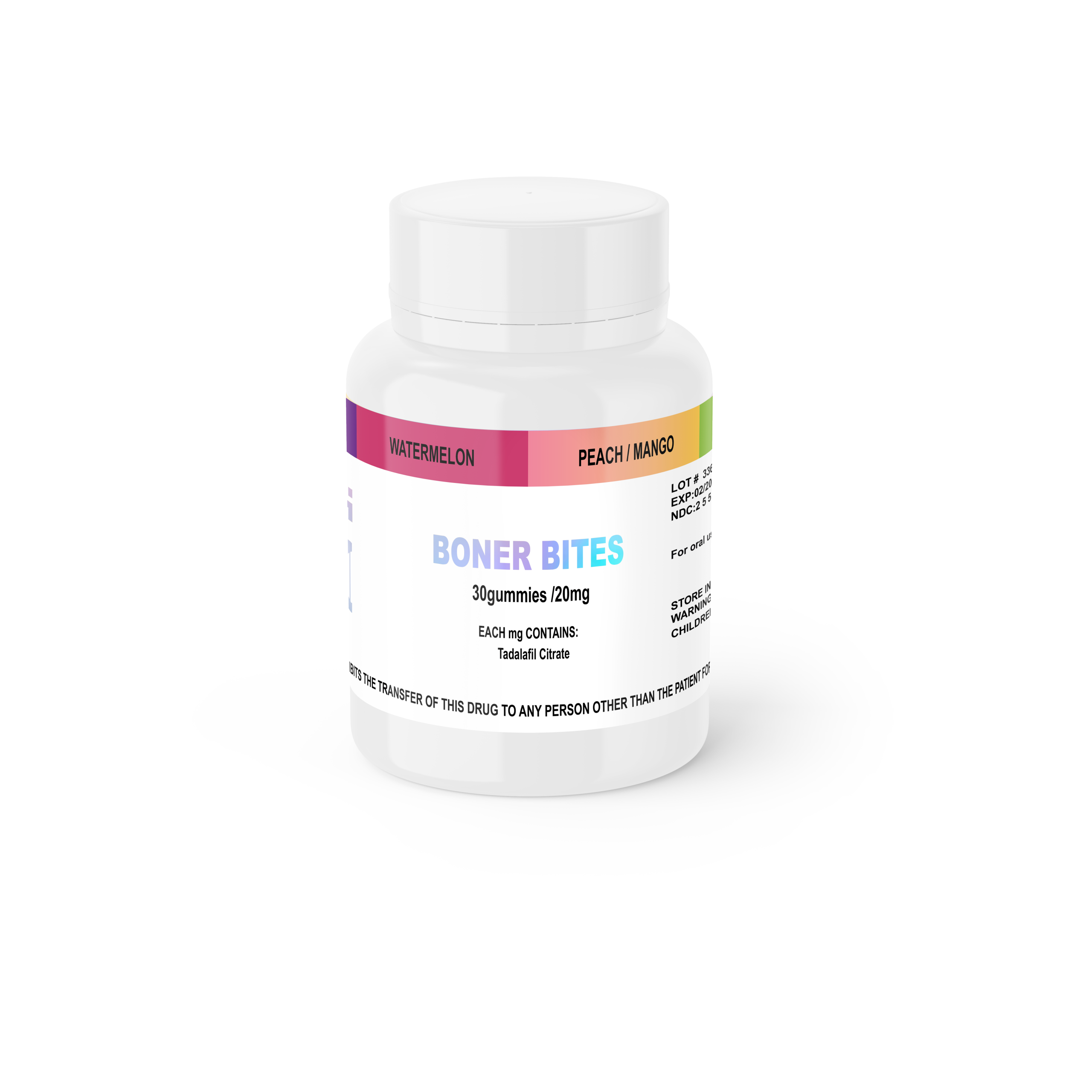 Boner bite is a tasty version of(Cialis), a popular Erectile Dysfunction (ED) medication. Similar in function to Viagra, it works by increasing the blood flow to the penis. When the penile arteries relax and nitric oxide is released, this leads to a full, strong and longer lasting erection. There is also anecdotal evidence that Cialis can increase sexual pleasure for women. Cialis will greatly enhance an erection with users noticing its effects within two hours, with results lasting from 36-48 hours. Daily cialis administration is also used to treat Benign Prostatic Hyperplasia (BPH), and is also effective at lowering high blood pressure.